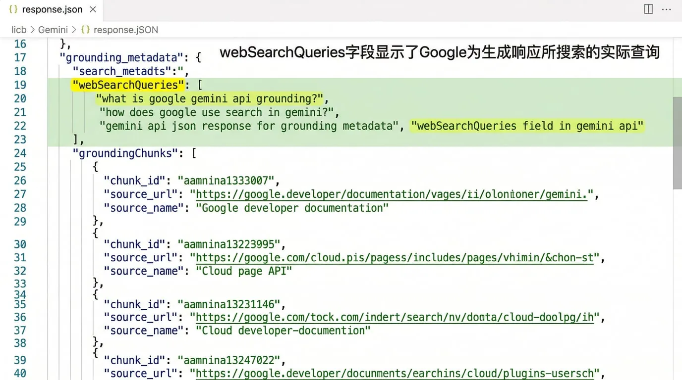 webSearchQueries 字段显示了 Google 为生成响应所搜索的实际查询。